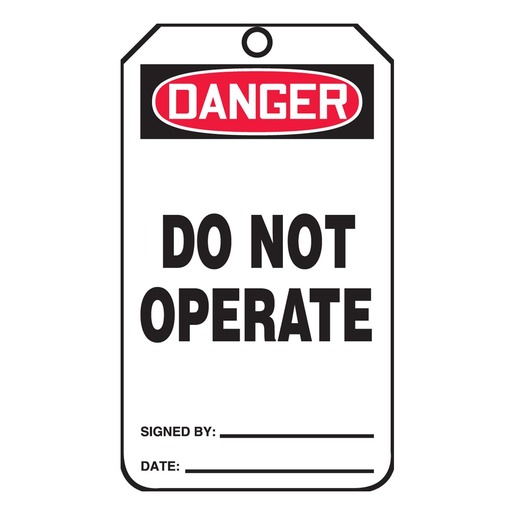 Accuform Signs “DANGER DO NOT OPERATE” Accident Prevention Safety Tag measuring 5 34″ X 3 14″ is printed on HS laminate with standard back B and the thick laminate withstands rough handling. Tag recognizes the potential dangers regarding elevator or escalator use and is ideal for harsh conditions. Tag resists tear, weather, chemicals and endures dirt and grease environments. The scratch resistant matte surface is easy to write on and is pressure sealed on both sides without edge seams. The top has a 38″ hole that is reinforced with a metal grommet and resists UV rays for 3 – 12 months. It is sold as 25 per pack.