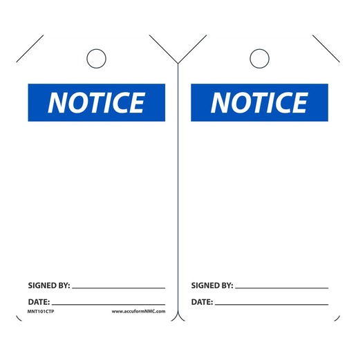 Accuform Signs BlueBlackWhite “NOTICE” Accident Prevention Blank Tag measuring 5 78″ X 3 18″ is printed on 10 mil polyolefin based PF-cardstock with no wood or paper content. Tag is ideal for indoor or short-term outdoor use and is designed to identify clearly and alert staff about cautions. The matte surface is scuff-resistant and effortless to write on with pen or marker. Top has a 38″ plain hole and endures extreme environments. It will not crack, distort or shrink. Tag can be used to alert staff to cautions by providing safety and it works in all enormous environments.