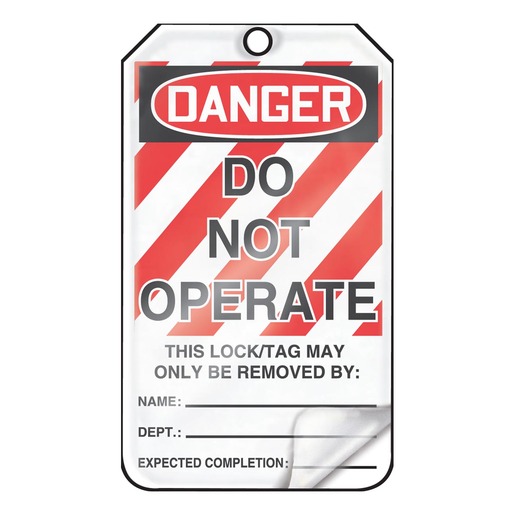 Accuform Signs “DANGER DO NOT OPERATE” Lockout Tag measuring 5 78″ X 3 18″ is made of HS-Laminate material for added durability. HS-Laminate is a composite of all poly materials pressure sealed on both sides with no edge seams. Waterproof tag is ideal for light-duty indoor or sheltered outdoor environments. Tag can be used to recognize crucial lockouttagout points to allow maintenance to be performed safely. Thick laminate tag stands up to abuse and rough handling. Tear proof and chemical resistant tag can be used in extreme weather conditions. Tag with an easy to write on, scratch resistant matte surface, is perfect for use in dirty and greasy environments. Tag has a 38″ hole at the top reinforced with metal grommet to avoid pull off.