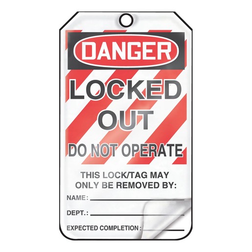 Accuform Signs “DANGER LOCKED OUT DO NOT OPERATE” Lockout Tag measuring 5 78″ X 3 18″ is made of HS-Laminate material for added durability. HS-Laminate is a composite of all poly materials pressure sealed on both sides with no edge seams. Waterproof tag is ideal for light-duty indoor or sheltered outdoor environments. Tag can be used to recognize crucial lockouttagout points to allow maintenance to be performed safely. Thick laminate tag stands up to abuse and rough handling. Tear proof and chemical resistant tag can be used in extreme weather conditions. Tag with an easy to write on, scratch resistant matte surface, is perfect for use in dirty and greasy environments. Tag has a 38″ hole at the top reinforced with metal grommet to avoid pull off.