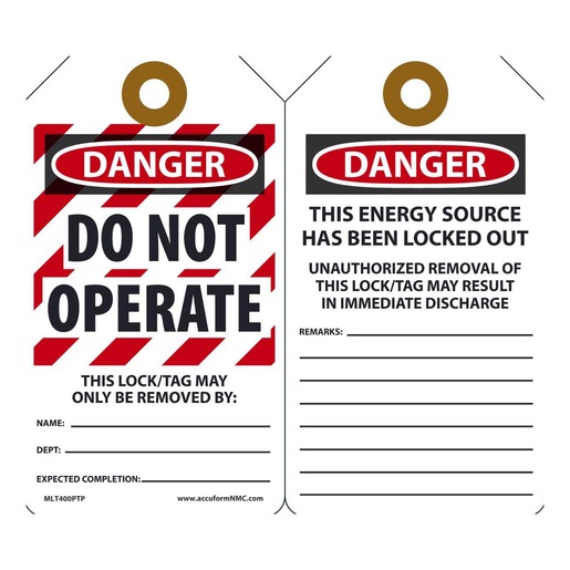 Accuform Signs “DANGER DO NOT OPERATE” Lockout Tag measuring 5 78″ X 3 18″ is made of 15 mil rigid RP-Plastic material for added strength and enduringness. Tag is used to recognize crucial lockouttagout points to allow maintenance to be performed safely. It is ideal for indoor and outdoor environments. High-strength plastic tag being water-resistant can be used in all weather conditions. Flexible tag will not readily break down over a wide temperature range. Durable tag with an abrasion resistant writable surface tolerates stretching and ripping. Tag has a 38″ hole at the top reinforced with metal grommet to avoid pull off.
