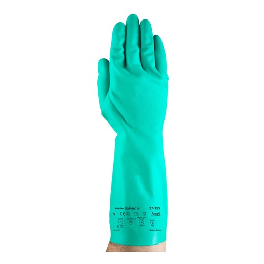Ansell Sol-Vex Size 8 Unlined Green Chemical Resistant Gloves with straight cuff are made of 15 mil durable nitrile and offer resistance against cuts punctures as well as abrasions. 13″ Gloves with sandpatch grip design feature curved fingers as well as contoured palm that reduces fatigue. Powder-free gloves have embossed texture improved grip that makes wet or slippery objects handling easier and render higher-level dexterity flexibility as well as comfort. Gloves are resistant to swell weaken or degrade. Gloves can be employed in industries such as aerospace automotive chemical processing food processing and service general industry janitorialsanitation military oil refining and petrochemical. Gloves are perfect for applications like beefporkpoultryfish processing food packing and handling for use in kill and processing areas laboratory testing fruit and vegetable processing. Gloves comply with 21 CFR 177.2600 FDA food-handling requirements and are sold as 12 bag per case each containing 12 pairs.Click Here to learn more about Ansell’s latest innovations