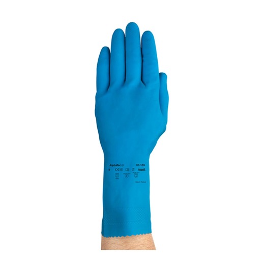 Ansell FL100 Size 9 Flock Lined Sky Blue Gloves with pinked cuff are made from unsupported 17 mil natural rubber latex for more durability and offer a high degree of tensile strength. 12″ Gloves with fishscale grip make it easier to keep hold of wet or dry objects including a comfortable cotton flock lining for more safety and for maintaining excellent sensitivity. Gloves are best combination of strength sensitivity and moderate chemical protection. Gloves resisting snag puncture abrasion and cut are ideal for plant maintenance janitorial and maintenance work canning and food processing applications. They are also used in automotive food processing general industry janitorialsanitation and pharmaceutical industries. Gloves comply with 21 CFR 177.2600 FDA food-handling requirements and are sold as 12 bags per case each containing 12 pairs.Click Here to learn more about Ansell’s latest innovations