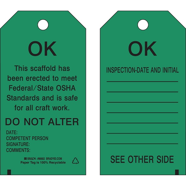 Accuform Signs 5 34" X 3 14" Black And Green 10 mil PF-Cardstock English Scaffold Status Tag "OK THIS SCAFFOLD HAS BEEN ERECTED TO MEET FEDERALSTATE OSHA STANDARDS AND IS SAFE FOR ALL CRAFT WORK" With 38" Plain Hole (25 Per Pack)