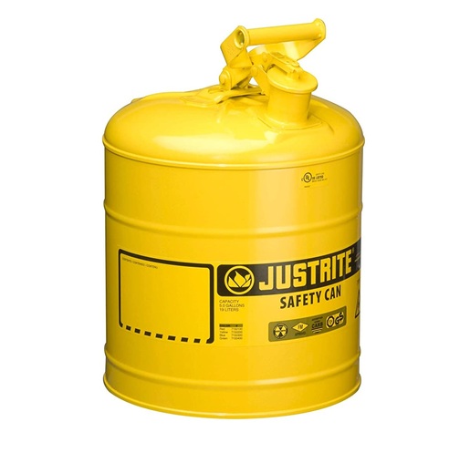 Justrite Type 1 Yellow 5 gal Safety Can made from galvanized steel with a powder paint finish is designed to store diesel while enduring rigorous use. Can with 11 34″ O.D has a 1.58″ fillpour hole and features a self-venting, self-closing leak proof lid that offers safety from spills. Can featuring a 3 12″ stainless steel flame arrestor that facilitates easy carrying of heavier loads has a large label ID zone on the swing handle allowing you to identify contents, department location as well as the user name of the individual. Can that offers great chemical resistance and corrosion protection has long length to facilitate safe insertion of gas nozzle.