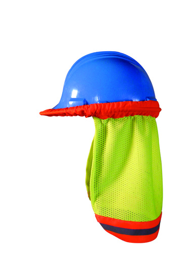 HI-VIS ORANGE FOLDABLE HELMET BRIM WITH ORANGE MESH NECK SHADE, TWO-TONE REFLECTIVE TAPE, ATTACHED STORAGE POUCH
