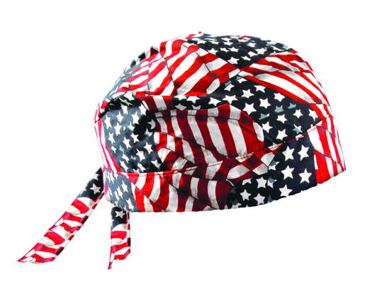 OccuNomix Tuff Nougies Regular Wavy Flag Tie Hat is made of 100% cotton for comfort and durability. Rear tie hat with double cotton layer sweatband features holographic hangtag and plastic hook for easy wearing. Hat is designed to protect welders, construction workers and others to avoid skinscalp irritation from helmets, hardhats or other head shields. It absorbs annoying and distracting perspiration. It is ideal for workers with long hair to fit snugly, to protect hair from being drawn into machine parts such as chains, belts, rotating devices, suction devices, blowers and hair that can even be drawn into machines otherwise guarded with mesh. Hat is also used to protect a variety of workers from paint, plaster, dust or shop dirt and head protection from sun as well as wind.