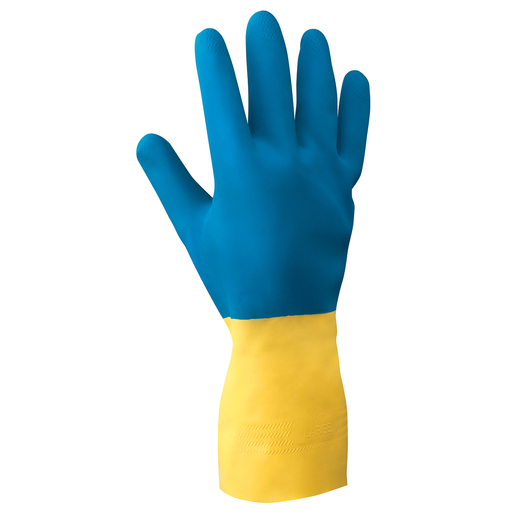 Chemical resistant, neoprene-over-natural rubber latex, unsupported, 12″, 22-mil, flock lined, yellow over blue safety feature, tractor-tread gripextra large